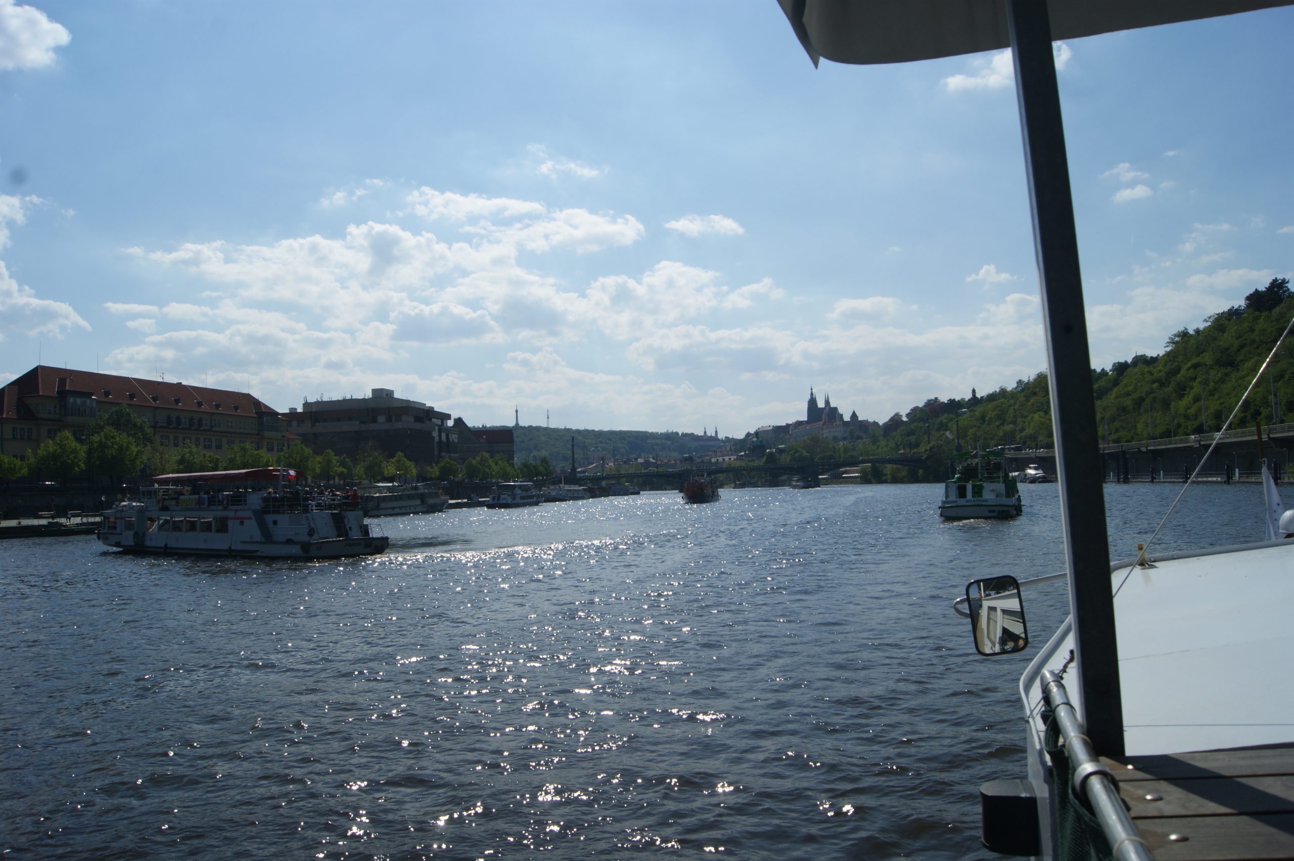 Prag vom Wasser aus. Rechts und links schöne Gebäude und tolle Kunstinstallationen: