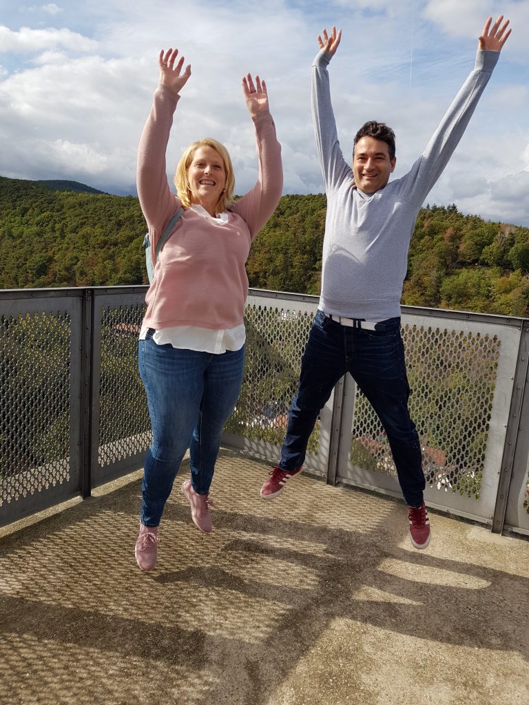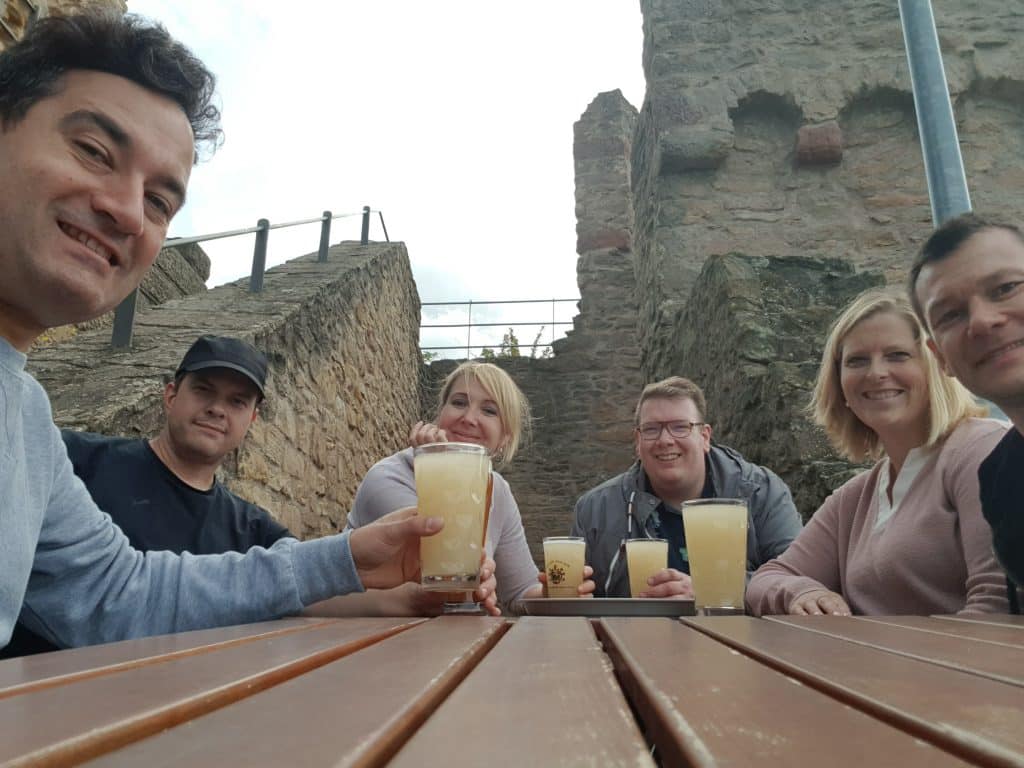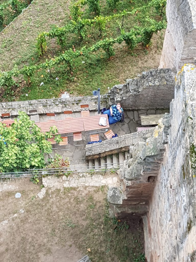 Danach mussten wir erst einmal frische Luft tanken und machten uns auf den Weg zur Wachtenburg. Oben angekommen, gab es etwas zu trinken. Ob es gut ist, in luftiger Höhe herumzuspringen? Schaden getan hat es uns nicht.