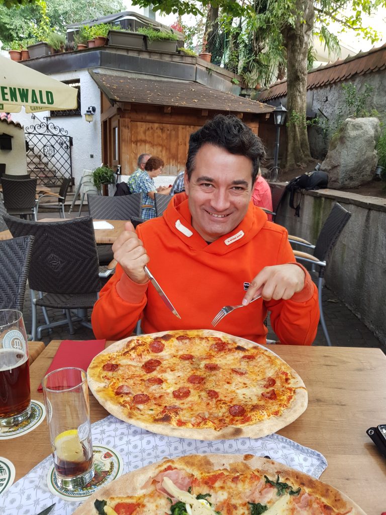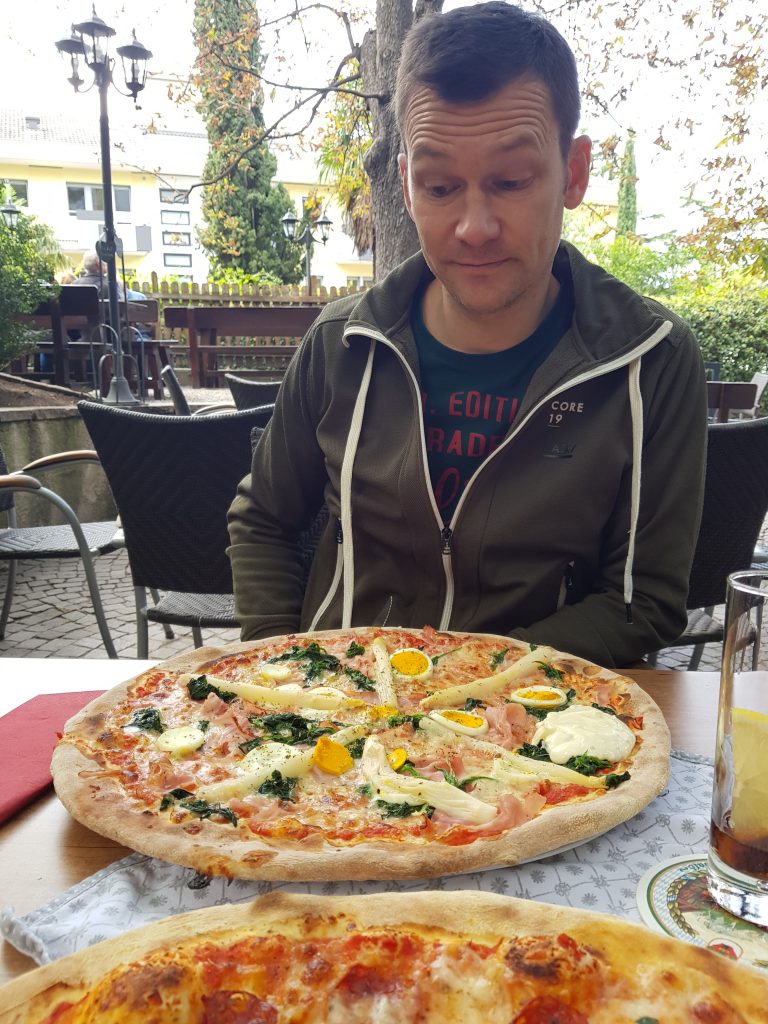 Am Abend gehen wir zum zweiten Mal ins Restaurant Mösl. Wir haben hier bereits 2017 gut gegessen. Ich empfehle euch daher das Restaurant Mösl am Priamiweg 1 in Meran! Die Betreiber sind vor Jahren vom Mittenwald nach Südtirol gegangen. Die Pizza ist so groß, das ist wirklich erstaunlich – und lecker! Passende Teller haben sie hier jedenfalls nicht.😂