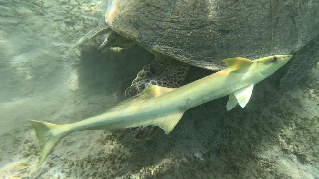 Grüne Meeresschildkröte mit Gestreifter Schiffshalterfisch